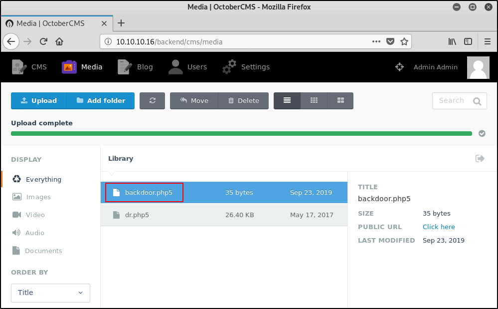 Также на это намекал уже существующий php5-скрипт в библиотеке. Поэтому я нажал Upload и загрузил самый банальный бэкдор, который смог придумать.