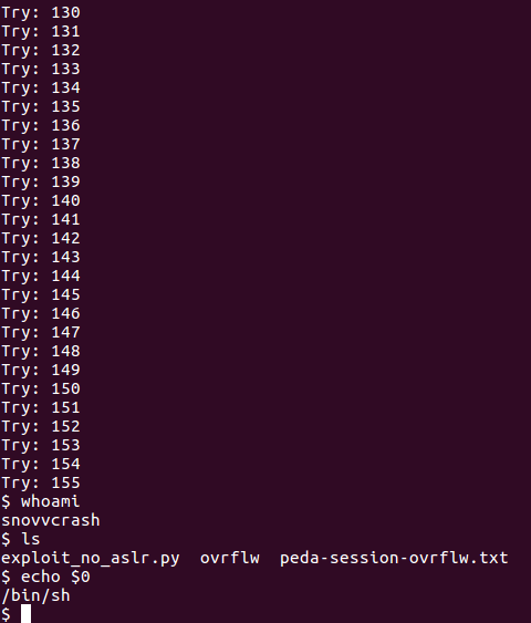 Таким образом, мы обошли защиту от выполнения кода в стеке. Сама по себе защита DEP не может помешать проведению атаки ret2libc, т. к. в данном случае мы задействуем уже существующий в адресном пространстве машинный код. Для усложнения проведения эксплуатаций подобного рода применяется технология рандомизация размещения адресного пространства ASLR, благодаря которой адрес загрузки стандартной библиотеки в память меняется с каждым вызовом программы. Для 64-битных архитектур это решения и правда сильно затрудняет жизнь «низкоуровневому» нарушителю, однако на 32-битных системах адрес libc вполне легко можно подобрать при условии отсутствия ограничений на количество разрешенных запусков уязвимого исполняемого файла.