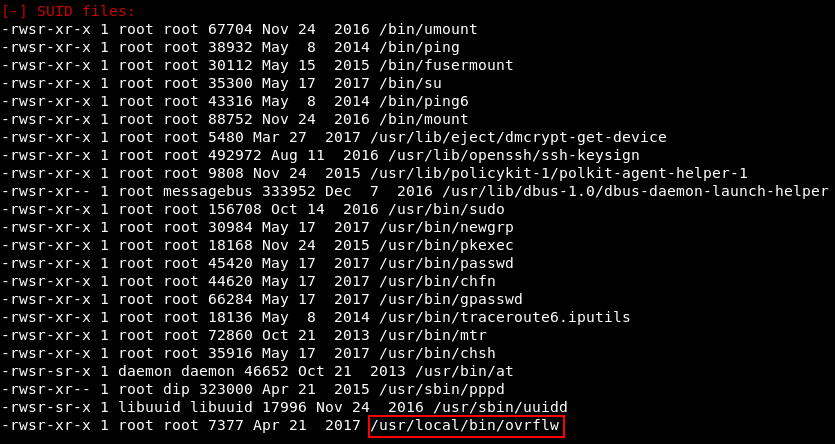 Внимание привлек нестандартный файл /usr/local/bin/ovrflw, владельцем которого является root. Взглянем на него поближе.