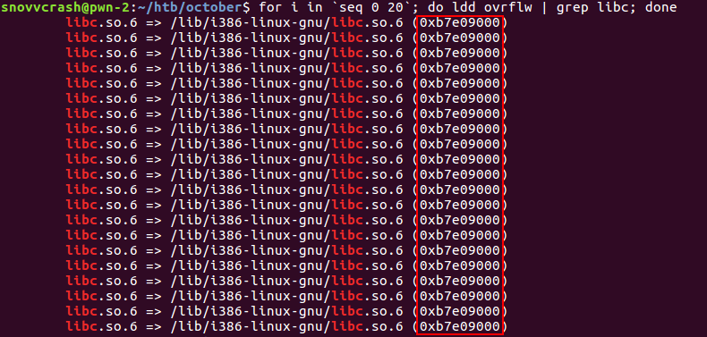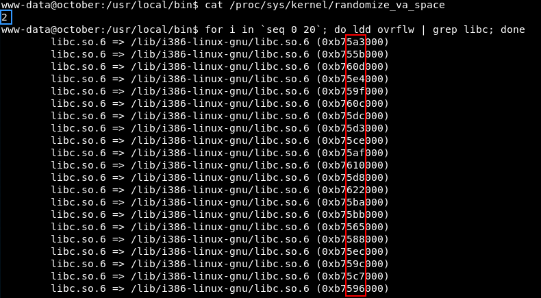 Активируем ASLR и взглянем на то, как меняются адреса загрузки libc, снова выполнив скрипт ldd в цикле.