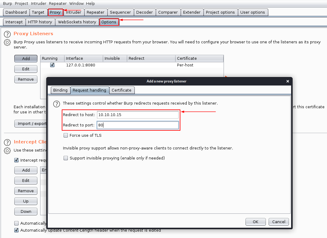 Сначала исследуем состояние безопасности с помощью davtest. К сожалению, эта утилита не позволяет указать прокси-сервер, чтобы посмотреть, какие именно запросы были отправлены, поэтому мы пойдем на хитрость: запустим Burp Suite, перейдем на вкладку Proxy → Options и добавим еще один листенер 10.10.10.15:80 на интерфейс loopback.