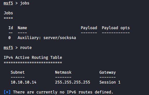 Первая команда покажет все процессы, которые запущены на фоне Metasploit (видим наш SOCKS-сервер), а вторая выведет список активных правил маршрутизации.