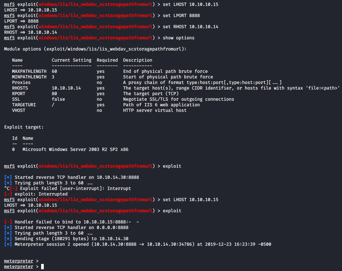 Для этого я опять выберу эксплоит iis_webdav_scstoragepathfromurl, но в этот раз его настройка будет немного отличаться: на роль машины атакующего (LHOST) я назначу хост Granny (10.10.10.15), а в роли порта для привязки хендлера (LPORT) выступит порт 8888 (через который все будет отправляться на Kali по SSH-туннелю).