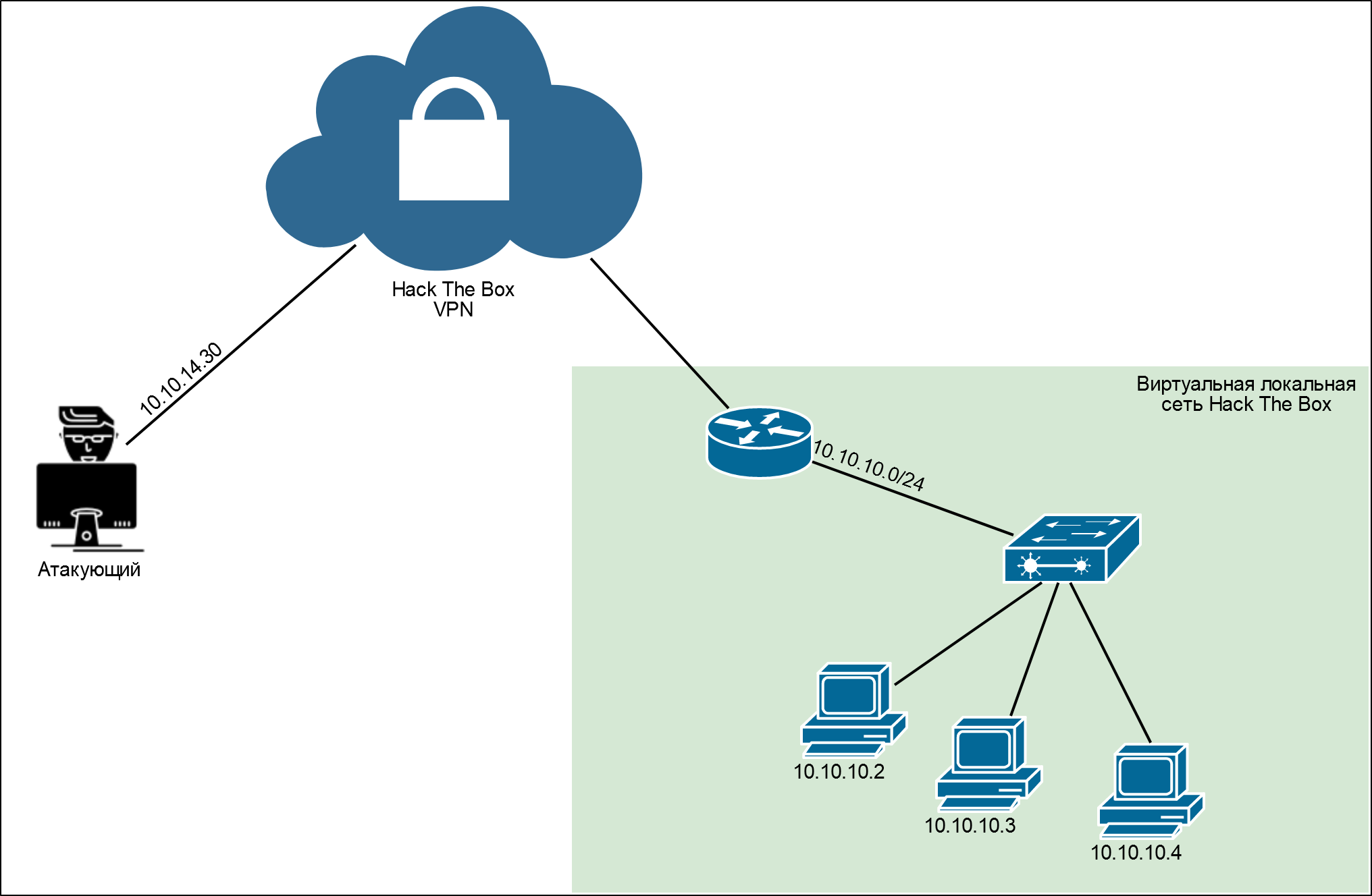 Упрощенно схему подключения к скрытому за VPN сегменту (виртуальной) сети лаборатории Hack The Box можно изобразить так.