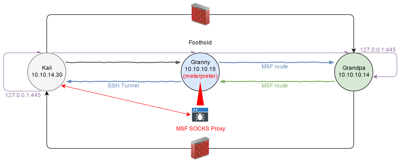 То есть поверх уже настроенного в Metasploit маршрута мы пробросили порт 445 с машины атакующего до порта 445 на ВМ Grandpa, который прежде был доступен только на loopback-интерфейсе из-за правил файрвола. В честь этого завершим обновление нашей схемы взаимодействия, добавив на нее проброс 445-го порта.