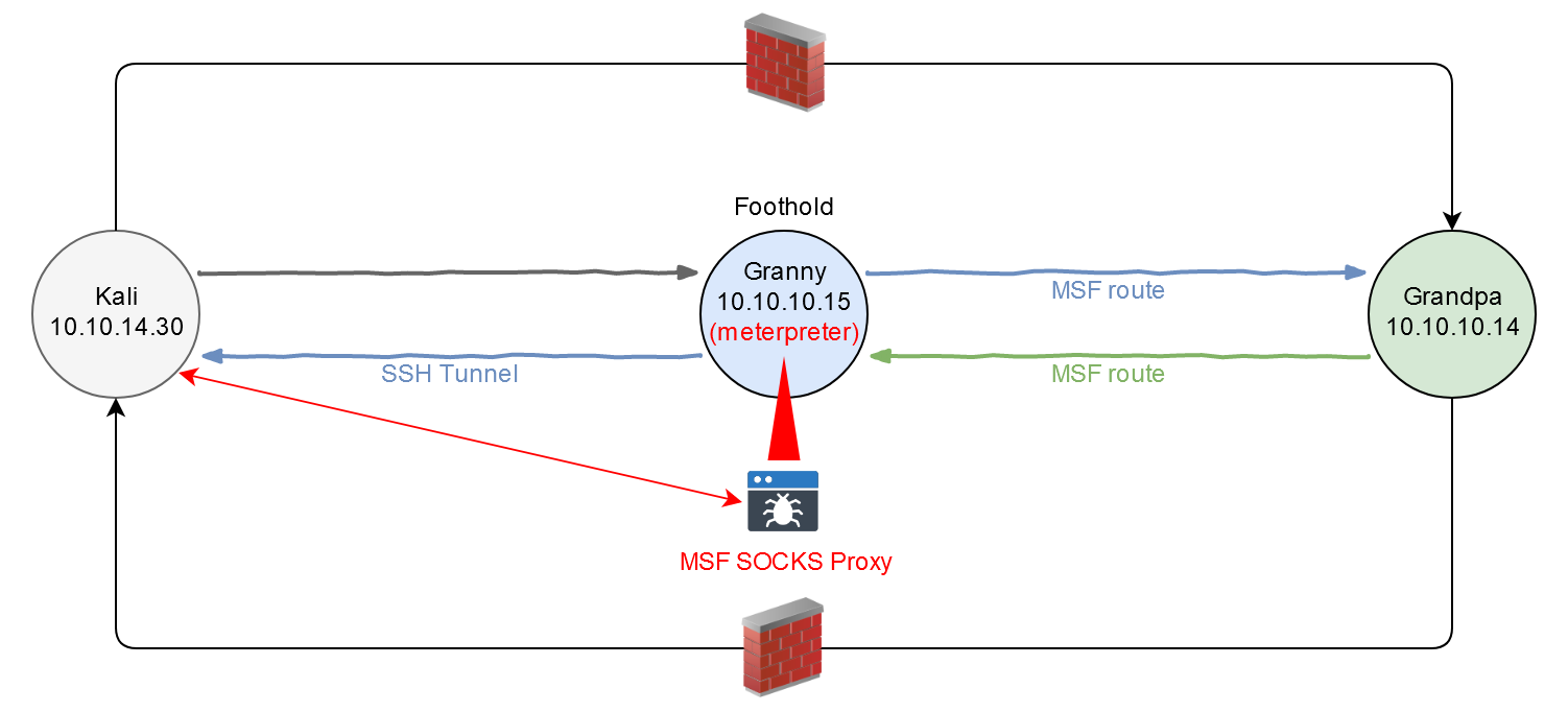 Чтобы у Grandpa тоже была возможность установить соединения с нашим хостом, мы должны настроить соответствующую маршрутизацию через foothold. Из-за того, что я искусственно дропаю трафик между собой и Grandpa, последний не может до меня достучаться (равно как и ответить я ему не тоже могу), и нам необходимо проложить эту часть моста коммуникаций вручную. Сделать это можно с помощью SSH-туннеля от точки опоры до машины атакующего.