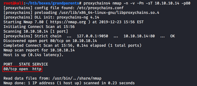 root@kali:~# proxychains4 nmap -n -v -Pn -sT 10.10.10.14 -p80