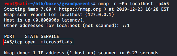 Этой командой я говорю, что локальный порт 445 (флаг -l) машины атакующего должен ассоциироваться с открытой сессией meterpreter, а все, что в него попадает, должно быть передано на удаленный порт 445 (флаг -p) машины-жертвы (флаг -r) по интерфейсу 127.0.0.1 (так как SMB доступен локально на Windows Server). Если повторно запустить Nmap и просканировать 445-й порт (заметь, уже на локалхосте) — о, чудо, он окажется открытым!