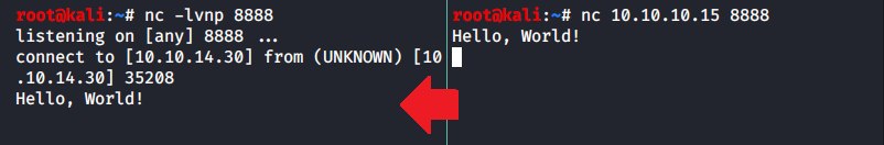 Это означает примерно следующее: «Granny, перенаправляй, пожалуйста, все, что поступит в порт 8888 интерфейса 10.10.10.15 по адресу 10.10.14.30:8888 через SSH-туннель». Проверить работоспособность можно с помощью обычного nc.