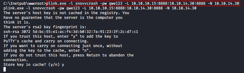 C:\Inetpub\wwwroot>plink.exe -l snovvcrash -pw qwe123 -L 10.10.10.15:8888:10.10.14.30:8888 -N 10.10.14.30