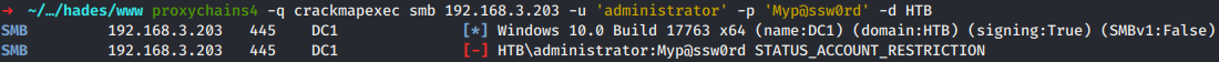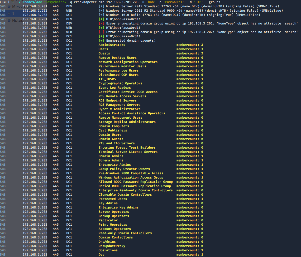 root@kali:$ proxychains4 -q lookupsid.py 'htb.local/bob:Passw0rd1!@192.168.3.203'