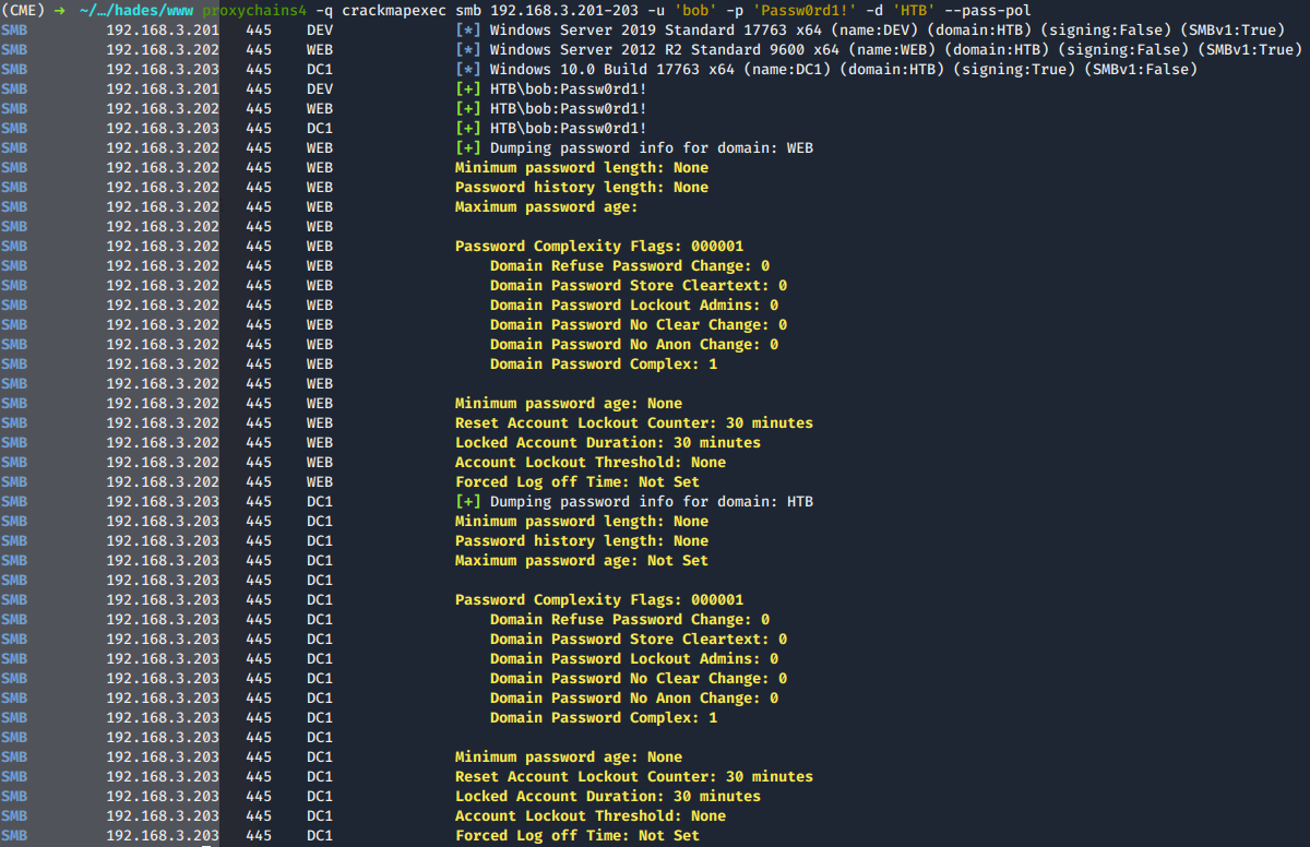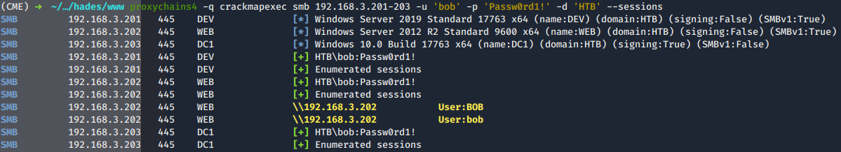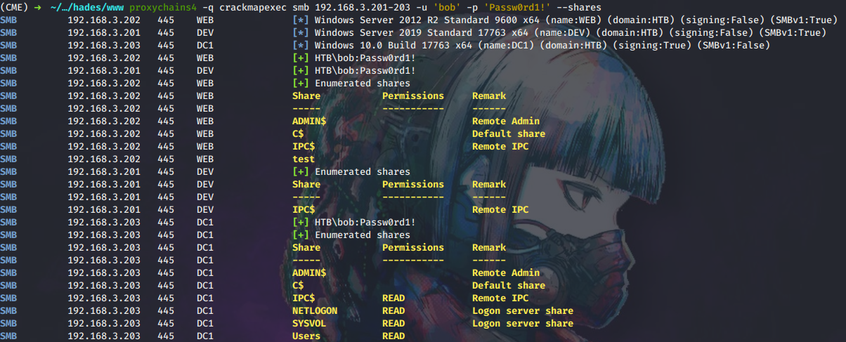 root@kali:$ proxychains4 -q crackmapexec smb 192.168.3.201-203 -u 'bob' -p 'Passw0rd1!' --shares