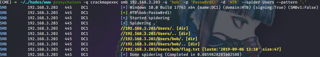 root@kali:$ proxychains4 -q crackmapexec smb 192.168.3.203 -u 'bob' -p 'Passw0rd1!' -d 'HTB' --spider Users --pattern '.'