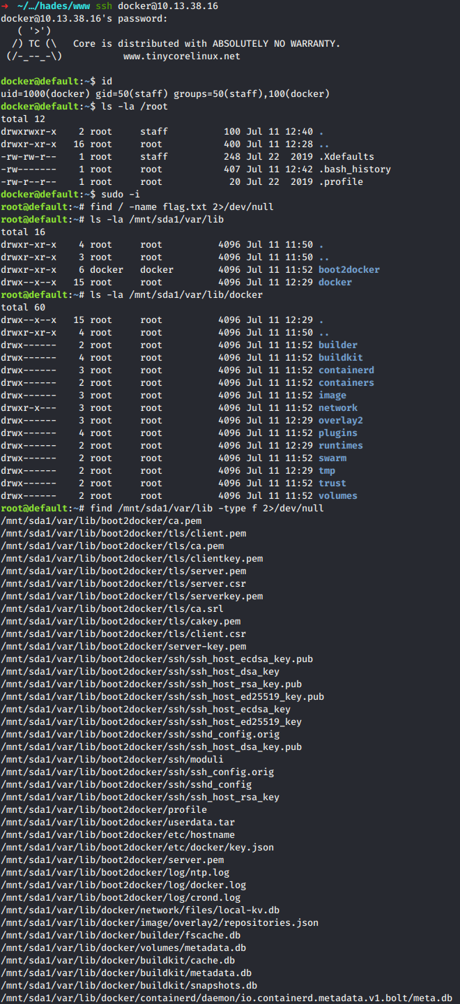 There is a web app at 10.13.38.16 with a CMDi vulnerability which becomes out entry point. After getting a shell on the box we find ourselves inside a Docker container. Having done some network reconnaissance we discover three more live hosts that matter: