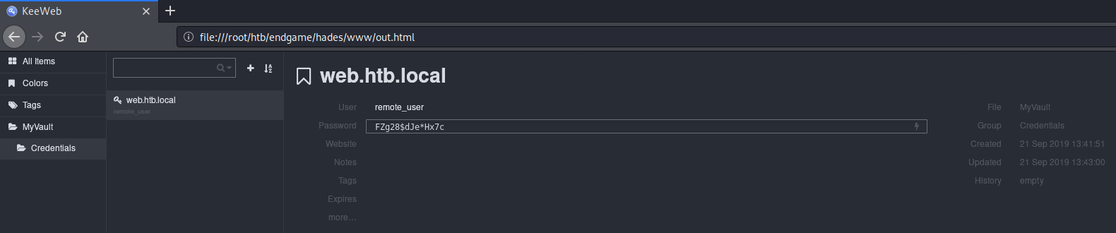 Also note that in some places where any type of non-permanent crypto stuff values are metioned (machine account passwords, hashes, etc.), there can be mismatches between the actual values of this crypto stuff. The Hades Endgame was being reset very often so some of these non-permanent secrets were being changed every time the lab started from its factory default state.
