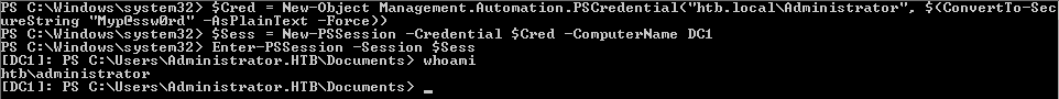 PS > $Cred = New-Object Management.Automation.PSCredential("htb.local\Administrator", $(ConvertTo-SecureString "Myp@ssw0rd" -AsPlainText -Force));Invoke-Command -Credential $Cred -ComputerName DC1.htb.local -ScriptBlock { type C:\Users\Administrator.HTB\Desktop\flag.txt }