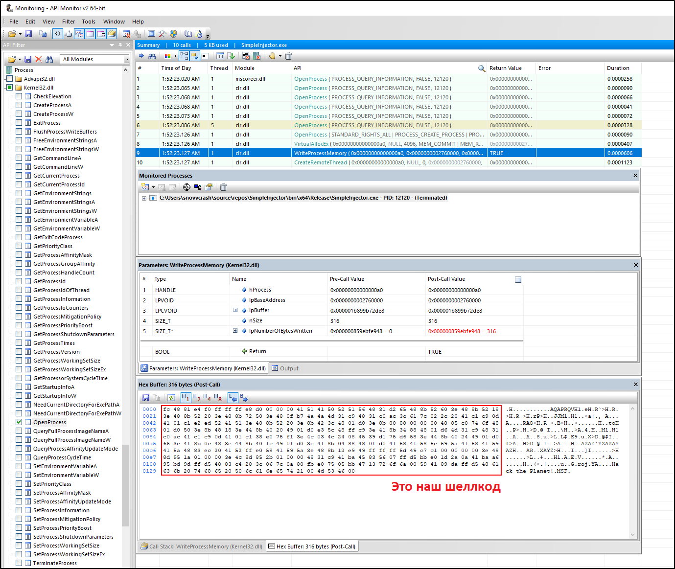 _ = WriteProcessMemory(hProcess, allocAddr, buf, buf.Length, out _);