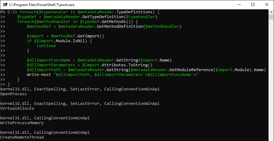 $dllImportFuncName = $metadataReader.GetString($import.Name)