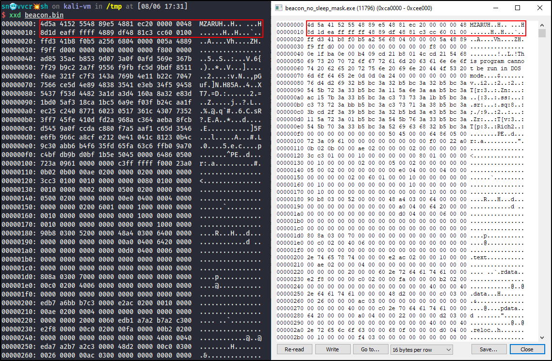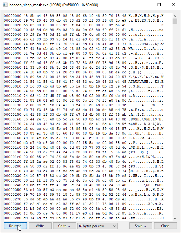 Возможно, это содержимое все еще не очень информативно (сама нагрузка чуть дальше в памяти стаба), но если пересоздать бикон без использование профиля, можно увидеть сердце маячка в чистом виде.