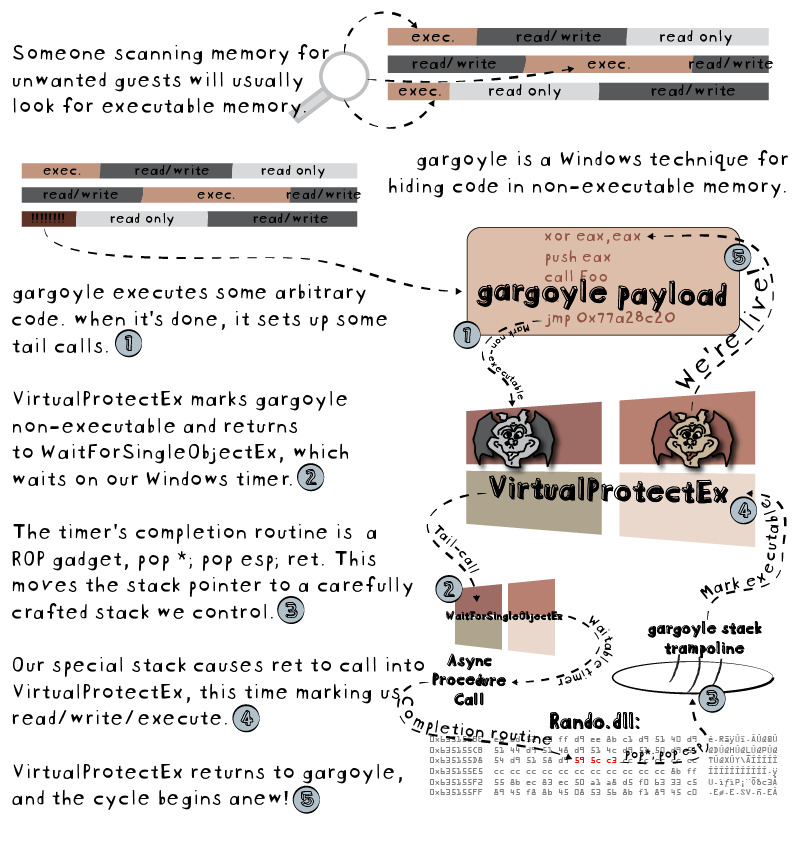 Если не углубляться в реализацию, его главная идея заключается в том, что полезная нагрузка (исполняемый код) размещается в неисполняемой области памяти (PAGE_READWRITE или PAGE_NOACCESS), которую не станет сканировать антивирус или EDR. Предварительно загрузчик gargoyle формирует специальный ROP-гаджет, который выстрелит по таймеру и изменит стек вызовов таким образом, чтобы верхушка стека оказалась на API-хендле VirtualProtectEx – это позволит нам изменить маркировку защиты памяти на PAGE_EXECUTE_READ (то есть сделать память исполняемой). Дальше полезная нагрузка отработает, снова передаст управление загрузчику gargoyle, и процесс повторится.