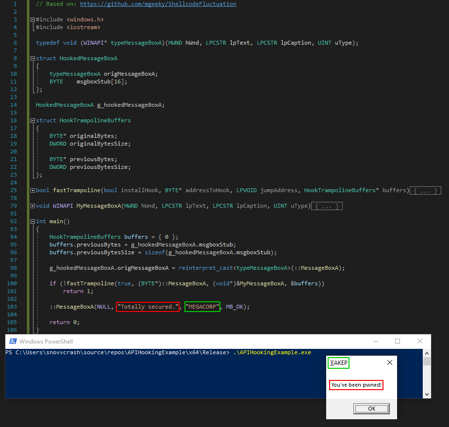 Хороший базовый пример реализации хукинга (как и многих других техник малдева) есть на Red Teaming Experiments, но мы разберем упрощенный пример на основе самого ShellcodeFluctuation, чтобы быть готовым к его портированию на C#. Вместо Sleep пока будем хукать функцию kernel32!MessageBoxA для более наглядного демонстрации результата.