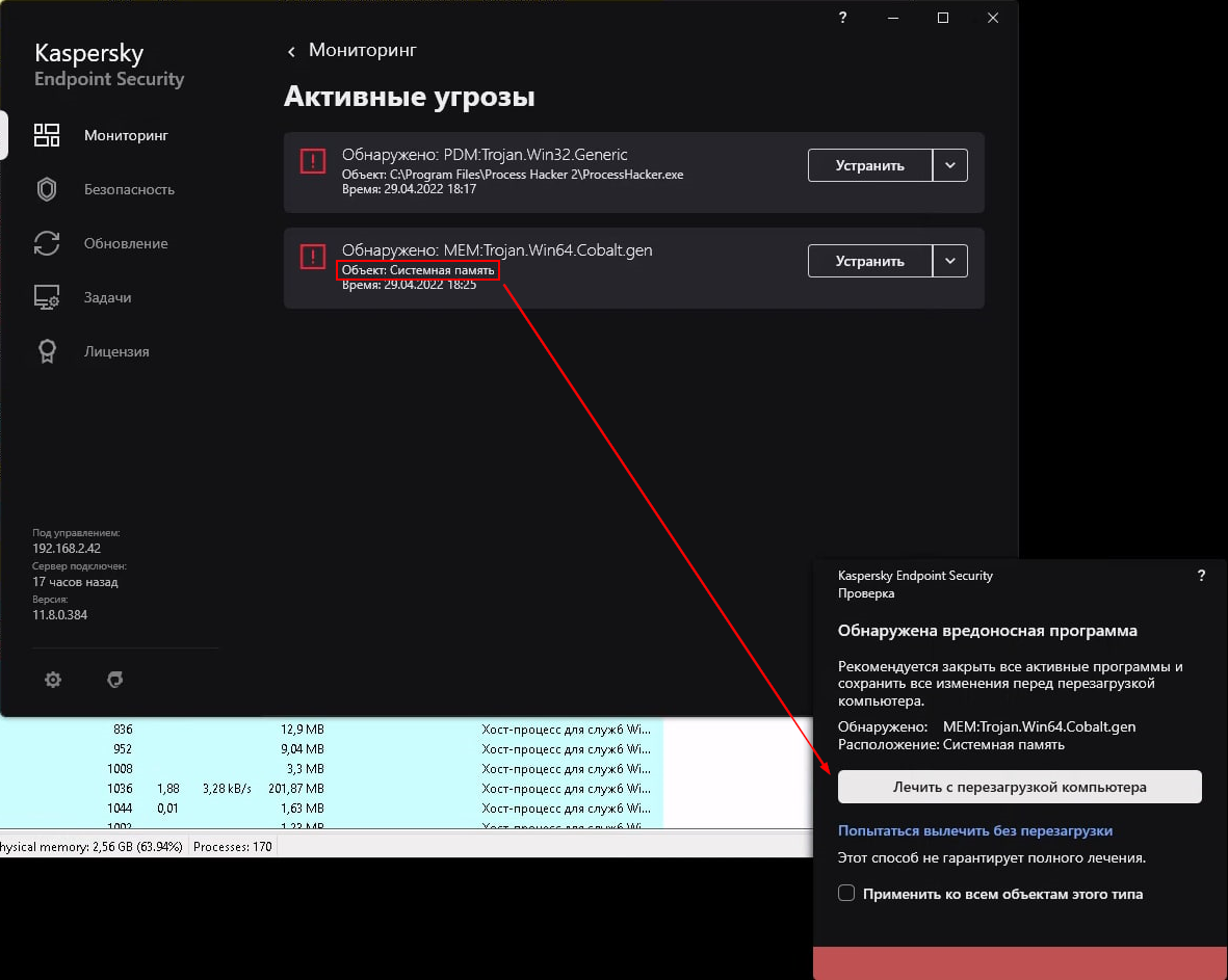 Если тебя спалят с вредоносом в системной памяти, который не подкреплен подозрительным бинарем на диске (например, когда имела место инъекция шеллкода в процесс), тот же Kaspersky Endpoint Security при дефолтных настройках не определит, какой именно процесс заражен и в качестве решения настойчиво предложит тебе перезагрузить машину.