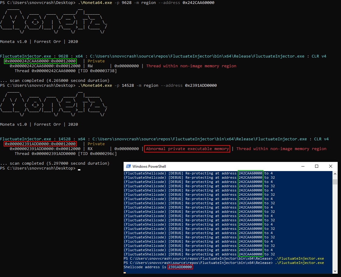 Если просканировать область памяти, содержащей шеллкод, с помощью Moneta, можно видеть, что мы избавились от одного из самых показательных индикаторов заражения – исполняемой приватной памяти.