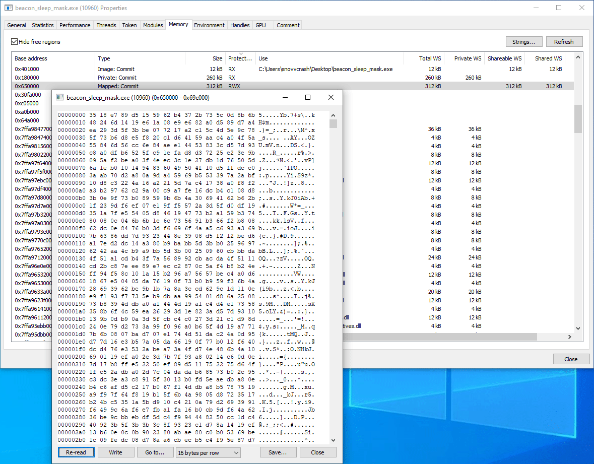 Далее с помощью Process Hacker найдем в бинаре «Кобы» сегмент RWX-памяти (при заданных настройках профиля он будет один) и посмотрим его содержимое.